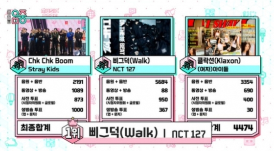 1위 후보로는 스트레이 키즈 '칙칙붐'(chk chk boom), NCT 127 '삐그덕' 그리고 (여자)아이들 '클락션'이 이름을 올렸다. 치열한 접전 끝 NCT 127이 출연 없이도 1위 타이틀을 거머쥐었다.