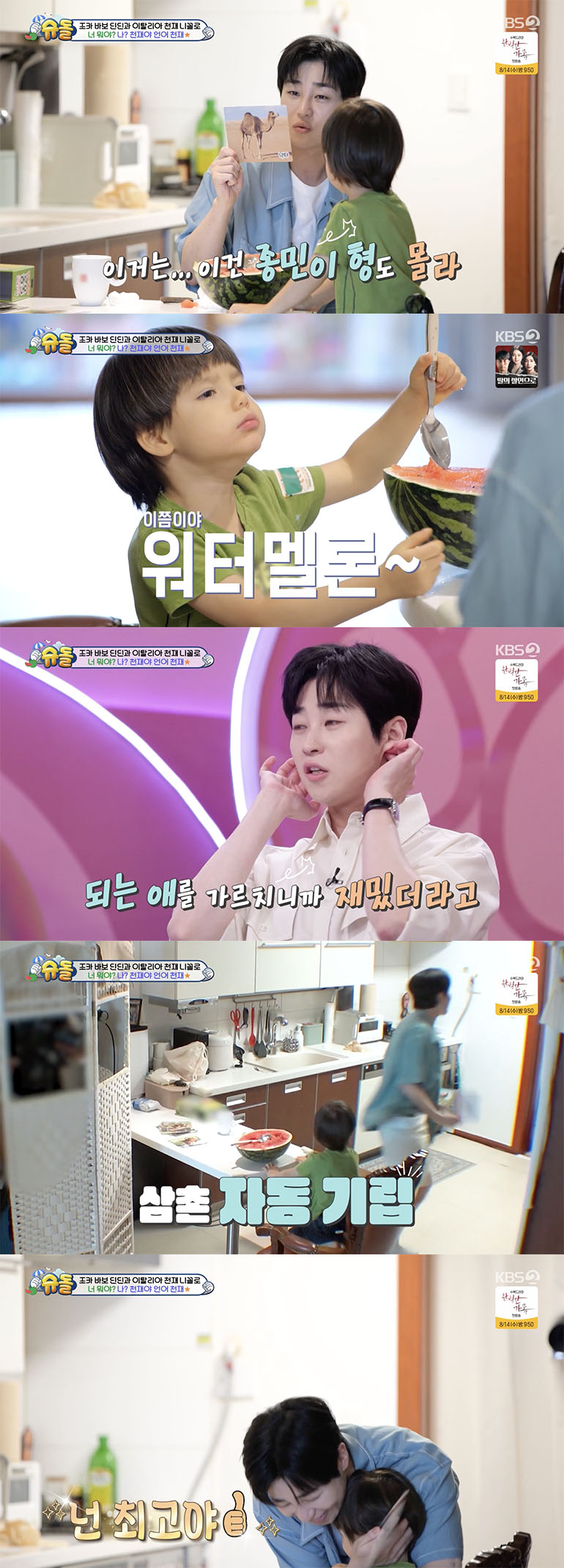 한편, 스튜디오에서 이를 지켜본 최지우는 "딘딘 삼촌이 드디어 교육열에 뛰어든 거냐"라고 했고, 딘딘은 자랑스러운 모습으로 "되는 애를 가르치니까 재밌다. 우리 엄마는 그게 안 됐거든요"라고 자조적인 답을 했다.