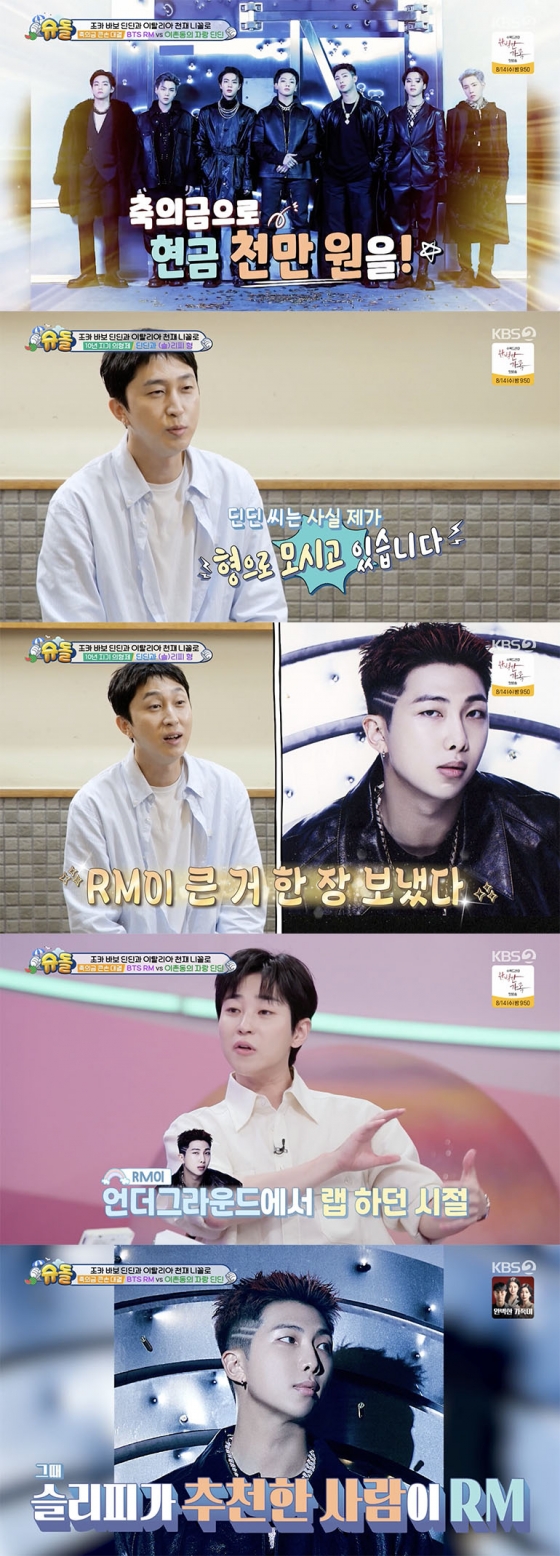이를 스튜디오에서 지켜본 딘딘은 "RM이 언더그라운드에서 랩을 할 때였다. 방탄소년단을 만든다는 얘기를 듣고 (관계자가) 슬리피 형한테 (래퍼를) 추천해달라는 연락을 받았다. 그때 슬리피 형이 추천한 사람이 RM이었다. 그렇게 BTS가 됐다"라며 슬리피와 RM의 오랜 인연에 대해 밝혔다.