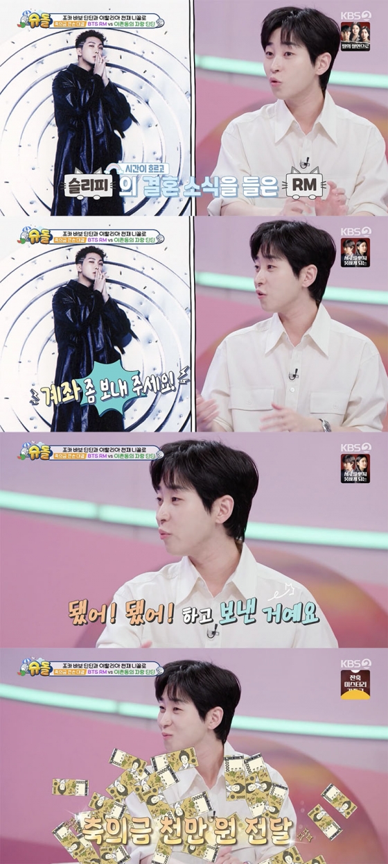 이어 그는 "RM이 DM으로 슬리피 형에게 결혼 소식을 들었다며 계좌를 보내달라고 했다더라. 슬리피 형이 '됐어! 됐어!'라고 하고 바로 계좌를 보냈더라. 그랬더니 바로 '띵동'하고 천만 원이 입금됐다고 하더라"라며 축의금 천만 원을 받게 된 비화를 털어놨다.