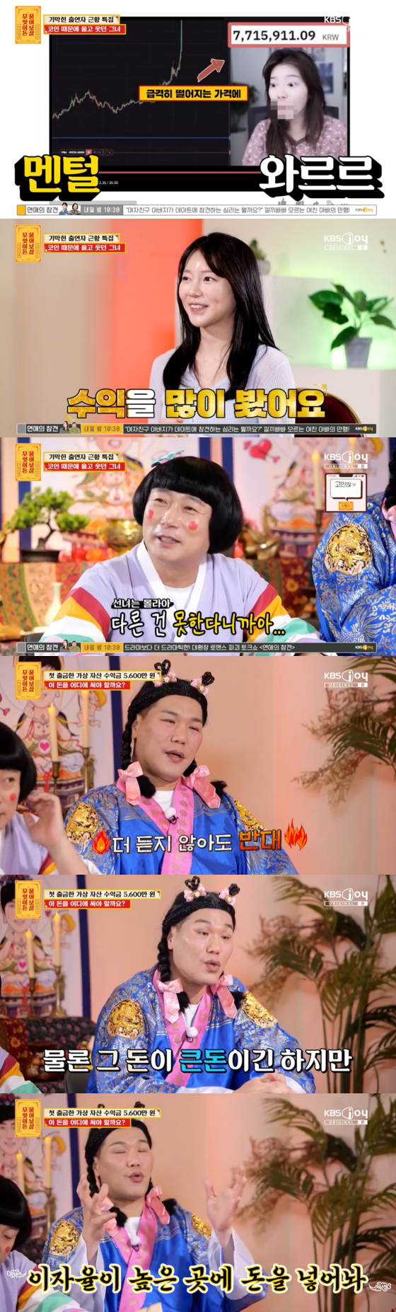 이날 사연자는 "좋은 소식을 들고 왔다"며 "이번에 수익을 좀 많이 봤다. 5600만 원 정도 수익을 봤다"고 밝혔다.