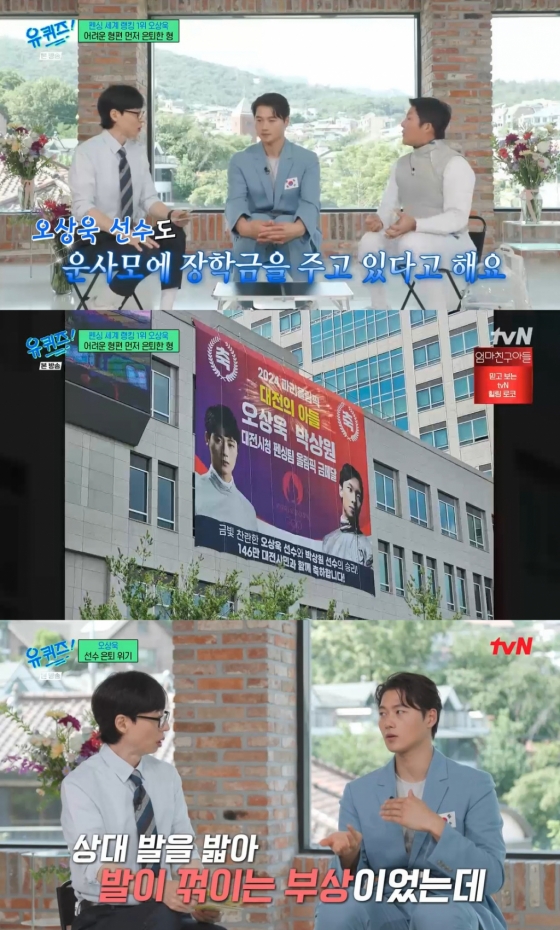 오상욱은 "어릴 때 키가 갑자기 컸다. 그래서 키 작은 사람이 하던 스태프를 할 수 있는 거다. 부모님이 두 명을 뒷받침하셔야 했다. 펜싱 장비는 비싸니 물려받아서 했다. 도복이 있는데 80~90만원이다. 재킷은 때리는 곳이니 센서가 고장 날 수 있으니 35만 원 정도 한다. 시합 몇 개 다녀오면 금방 바꿔야 한다. 부담이 안 될 수 없다"라고 어려웠던 가정 형편을 고백했다.