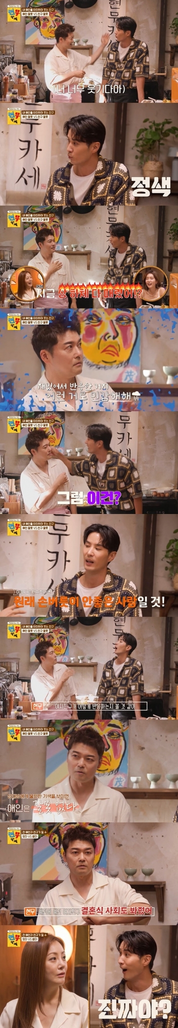 자신의 몸을 때리는 전현무에게 김지석은 "웃기면 박수를 쳐라. 왜 굳이 내 여자친구를 때리냐"라며 정색했다.