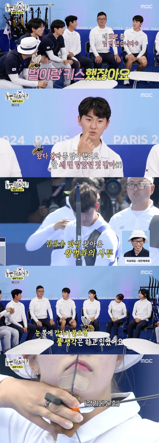 '놀면 뭐하니?'에서 김제덕이 경기 중 벌이 나타났던 상황을 언급했다.