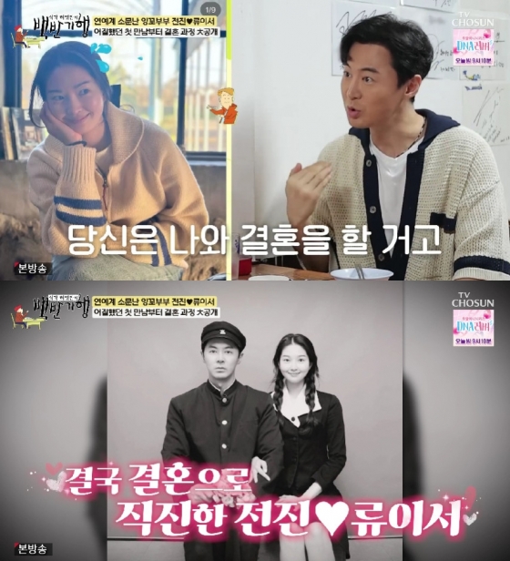 전진은 아내 류이서와 첫 만남에 대해 "친한 후배가 결혼한다니까 모임에 갔는데 '친한 언니가 온다고 하는데 들러도 돼요?'라고 하더라. 자리에 앉아 처음 보는 순간 눈을 뗄 수가 없었다. 그때부터 제가 말을 못 하는 거다. 음료수를 따라주는데 손이 덜덜 떨렸다. 제가 그런 스타일이 아니라서 저도 놀랐고, 이 사람도 그 모습 보고 조금씩 마음이 열렸다고 하더라"라고 전했다.