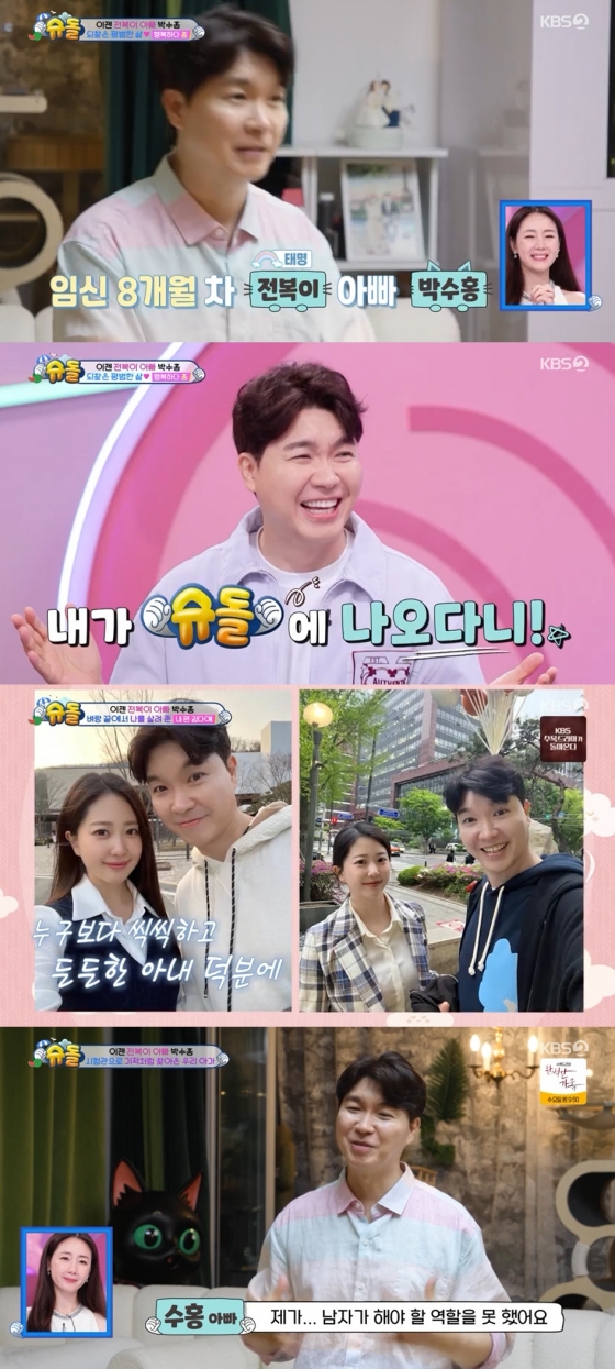 그는 "진짜 이제 (출산) 두 달 정도 남았다. 전복이(태명) 아빠 박수홍이다. 내가 '미운 우리 새끼'였는데 '슈돌'에 나오게 된다니 감격스럽다. KBS에 데뷔한 게 91년도인데 핑크색 배경 스튜디오는 처음이다"라고 환하게 웃었다.