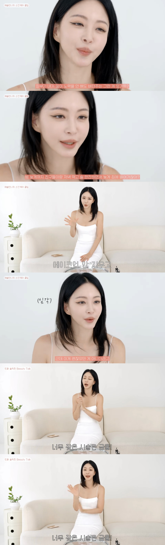 또 "늦게까지 술을 마시고 화장을 안 지우고 자도 피부가 멀쩡했는데 30대 후반이 되니 미친듯이 트러블이 일어난다. 그동안 케어를 안 해줘서 피부의 장벽이 완전히 무너져서 피부가 다 뒤집어진 것"이라고 설명했다.