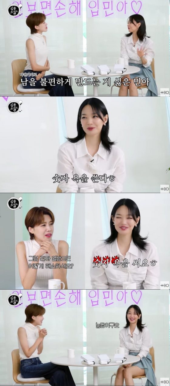 신민아는 '손해보기 싫어서' 속 자신이 맡은 역할 '손해영'에 대해 "목표를 향해서 달려가는 모습이 거칠게 보일 수도 있다. '이런 언니 있으면 좋겠다'는 생각이 드는 역할이다. 숫자 비속어도 한다"라며 웃었다.
