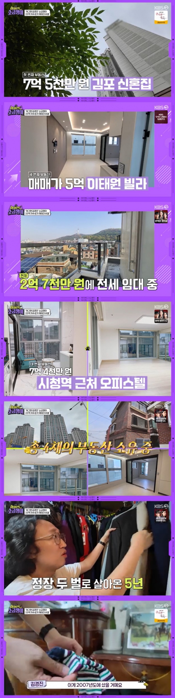 김경진은 "제 발로 하나하나 사서 모은 것이기 때문에 아쉬운 생각이 든다. 최근들어 부동산 정리를 좀 할까란 생각이 가끔 든다"고 행복한 고민을 말했다. 그는 "시청역 오피스텔을 분양받았는데 임대료가 세다. 단기 임대로 한 달 수익 250만 원을 내고 있다"고 했다.