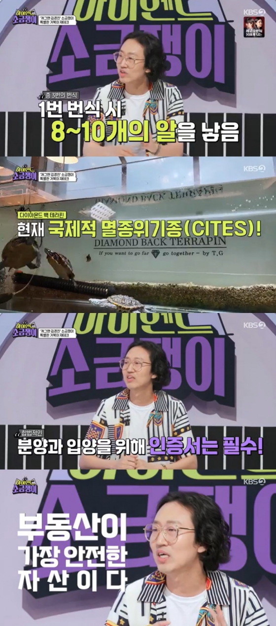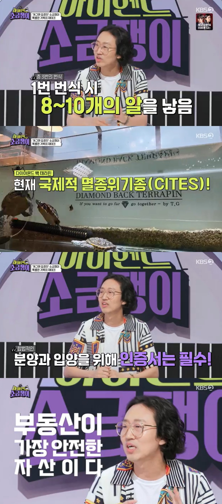 MC 양세형은 "불법 아니지 않냐"라고 물었고, 김경진은 "다이아몬드 백 테라핀 종은 현재 국제적 멸종위기종(CITES)이다. 인증서가 있어야 한다"라고 설명했다.