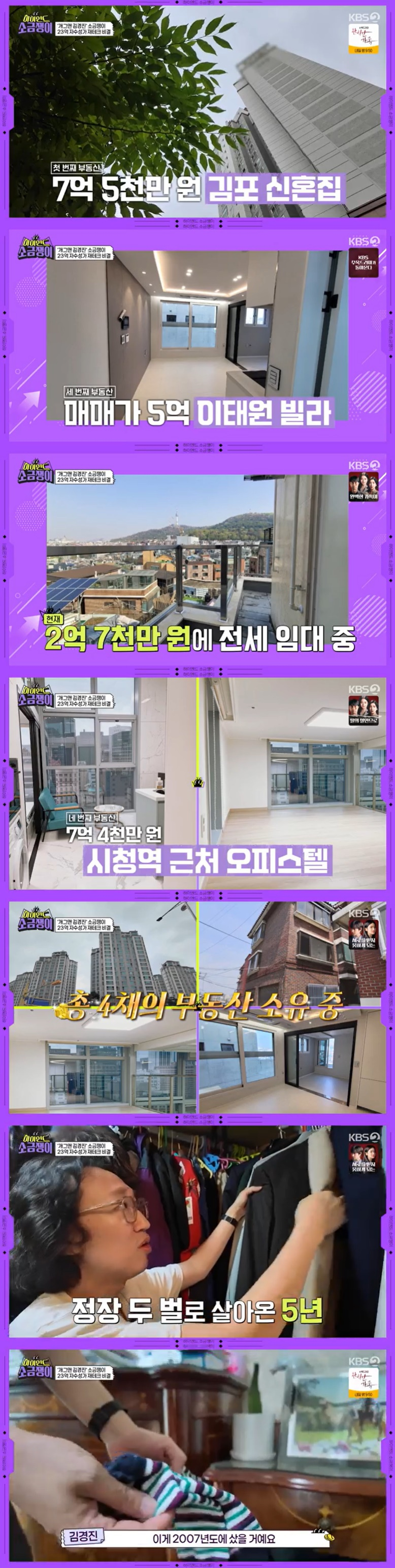 20일 방송된 KBS 2TV '하이엔드 소금쟁이'(이하 '소금쟁이')에서는 김경진이 '23억 자산가'로 자수성가한 근황을 공개했다.