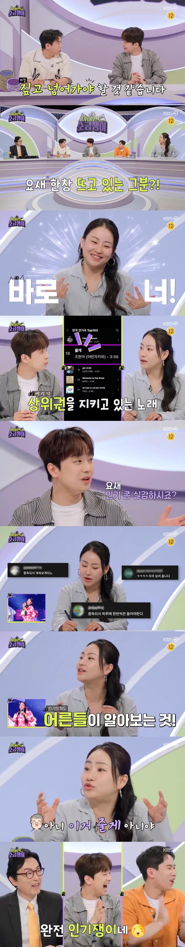 이찬원이 "인기 실감하지 않냐"라고 묻자 조현아는 "인기의 척도 중에 하나가 어르신들이 알아보는 것 아니냐. 어른신 분께서 '아유 '줄게' 아냐?'라고 하더라. '하이엔드 소금쟁이' 보시면 여러분들도 저처럼 부자될 거다"라고 너스레를 떨었다.