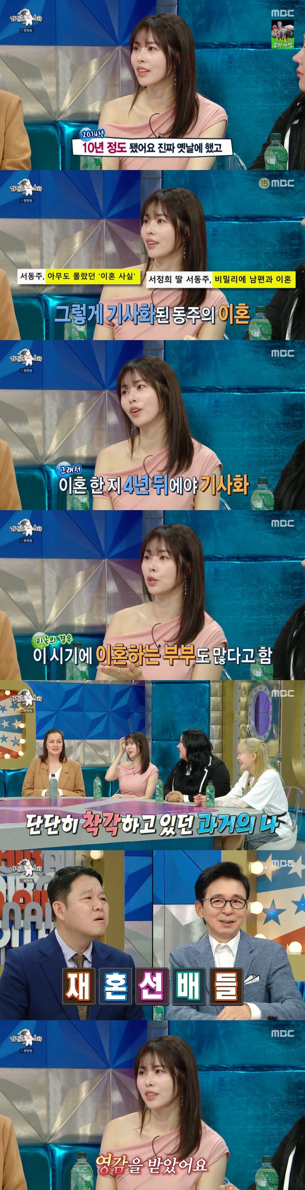 이날 서동주는 이혼 이슈로 실검(실시간 검색어) 1위를 차지했던 과거를 떠올렸다. "10년 정도 됐다. 진짜 옛날에 이혼했다"는 서동주는 "결혼 생활은 5년 정도 했다. 27세 결혼해서 31세에 이혼했다. 당시 이혼 소식만을 SNS에 올린 건 아니었다. 로스쿨 졸업 후 글을 남겼었다. 그동안의 시간을 돌아보는 글을 썼었다. 이후 '서동주 비밀리에 이혼했다'라는 기사가 난 거다"라고 밝혔따.