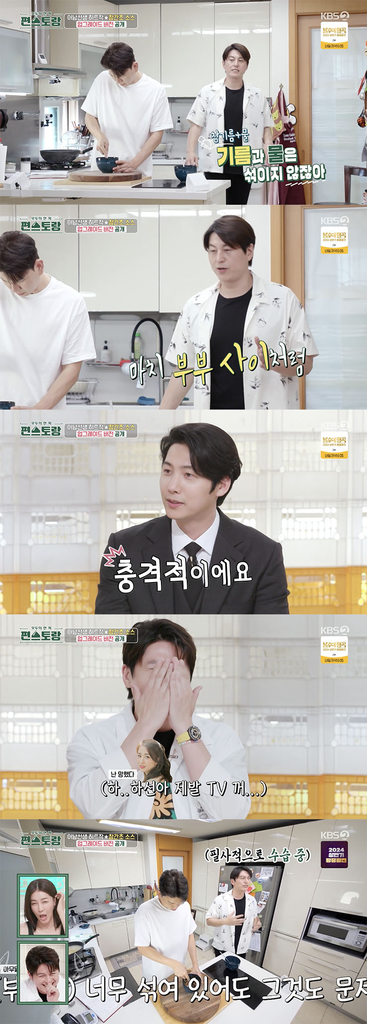 이어 류수영은 자신이 직접 개발한 시그니처 소스 '참간초 소스'의 업그레이드 버전을 제이쓴에게 전수했다. 제이쓴은 류수영의 지시에 따라 참기름에 물을 섞었다. 그러던 중 류수영은 "잘 섞으면 된다. 그런데 어차피 섞어도 기름과 물은 섞이지 않는다. 마치 부부 사이처럼"이라고 위험한 발언을 해 모두를 당황케 했다.