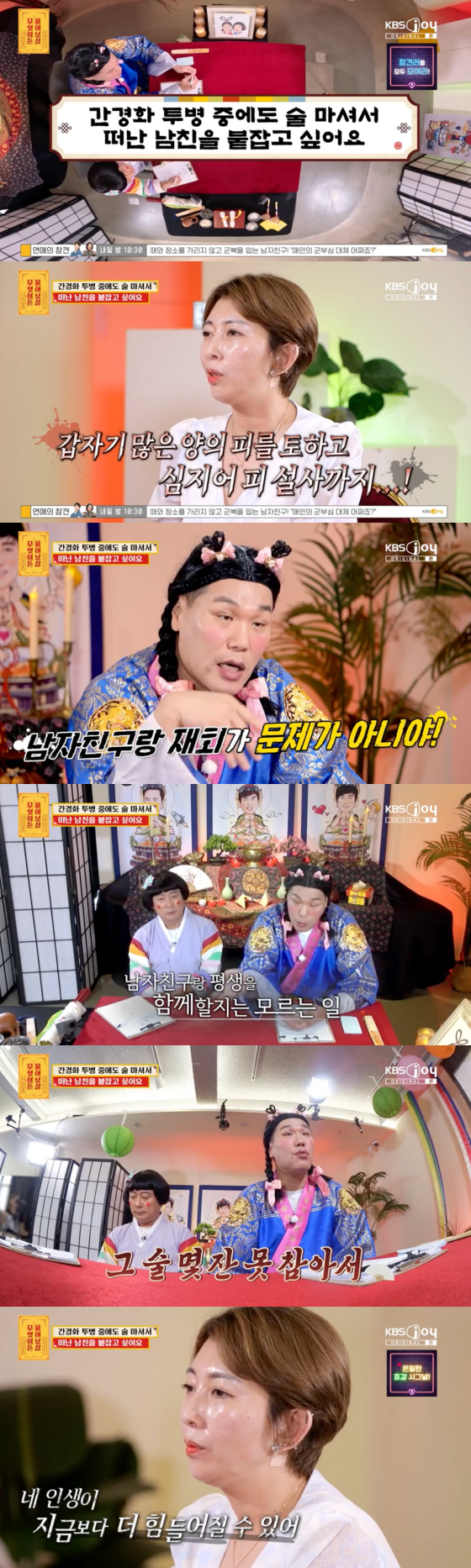 이날 출연자는 "2년 전 간경화 진단을 받고도 술을 몇 번 마셨는데, 함께 살던 남자친구가 떠나버렸다. 지금은 간경화 초기에서 중기로 넘어간 상태다. 남자친구를 다시 붙잡고 싶다"고 운을 뗐다.