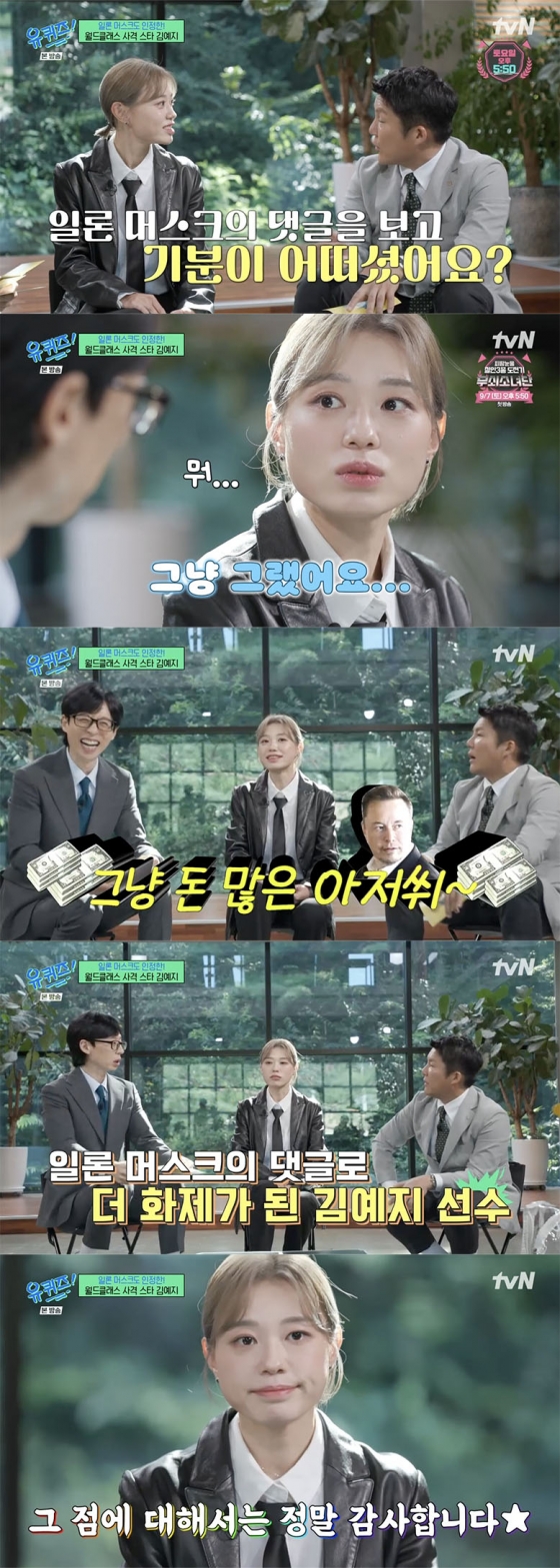 '유 퀴즈 온 더 블럭'에서 사격 국가대표 김예지가 일론 머스크의 샤라웃에 대한 자신의 생각을 전했다.