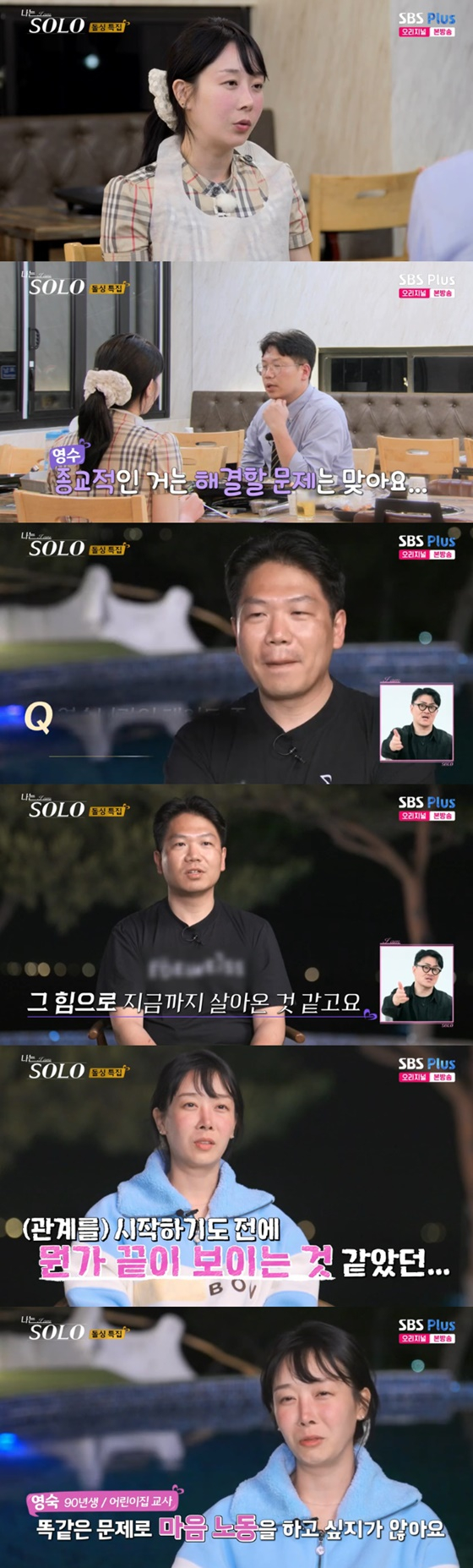 영숙은 제작진에게 "그분(영수)이 독실한 신자였다. 내 이혼 사유도 그게 컸다. 이것 때문에 마찰이 생길 거 같고, 이걸로 마음고생하고 싶지 않다"는 속내를 털어놨다.
