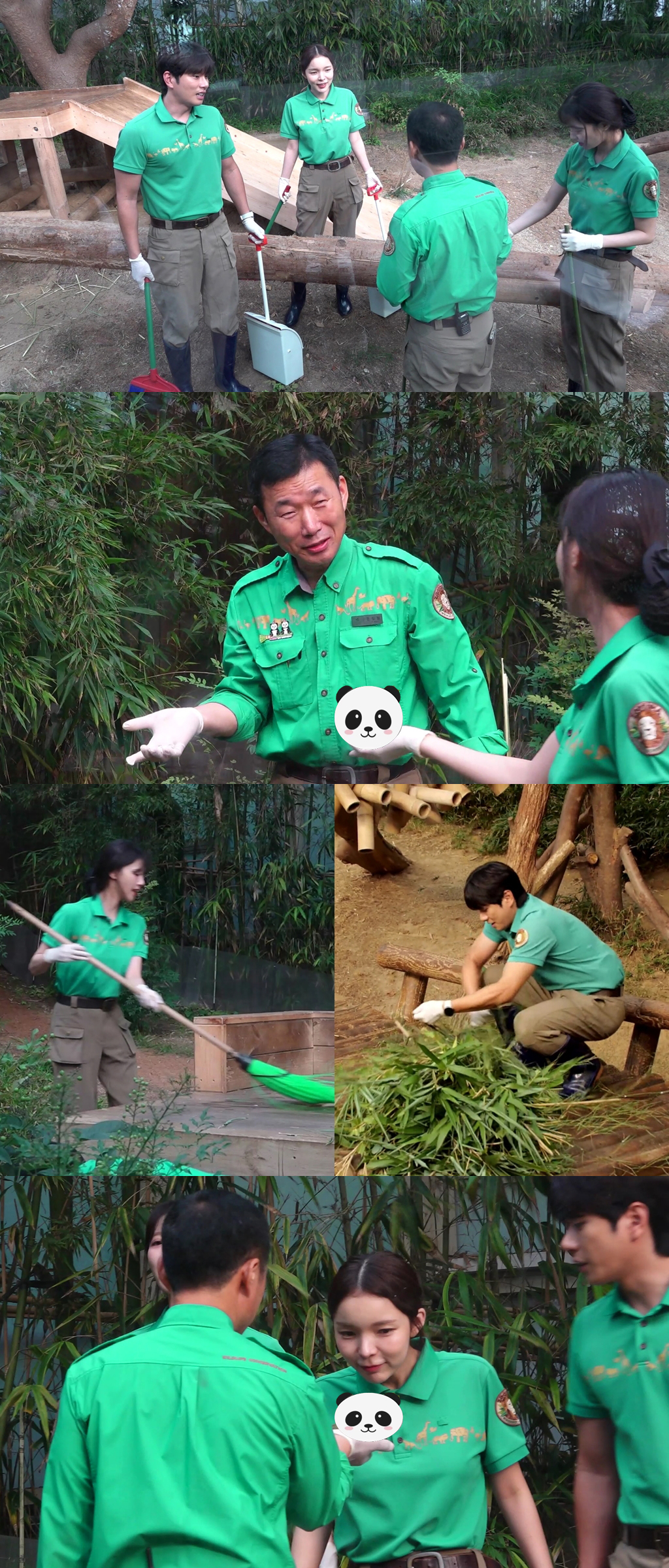 공개된 사진 속 판다월드에 입성한 세 사람은 초록색 유니폼을 착장한 채 '강바오' 강철원 주키퍼를 만난 모습이다. 강철원 주키퍼는 세 사람에게 판다들의 놀이터 청소 꿀팁을 전수해주고 있다.