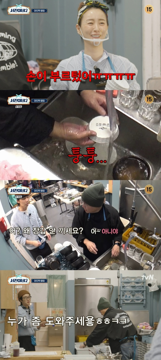 이날 이명한은 '서진이네2' 알바생으로 발탁, 설거지 요정으로 변신했다. 하지만 고무장갑을 끼지 않은 채 설거지를 해 멤버들에게 걱정을 샀다. 이를 본 정유미는 "손이 부르텄어. 손가락이 부르트셨어"라며 울상을 지었다.