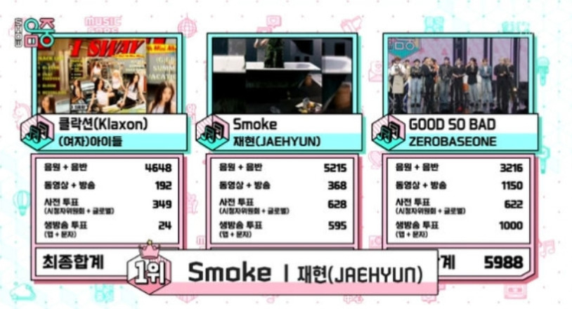 1위 후보로는 엔시티 재현 '스모크'(Smoke), (여자)아이들 '클락션' 그리고 제로베이스원 '굿 소 배드'(GOOD SO BAD)가 올랐다. 이후 치열한 경쟁 끝, 재현은 9월 첫주 1위를 거머쥐었다.