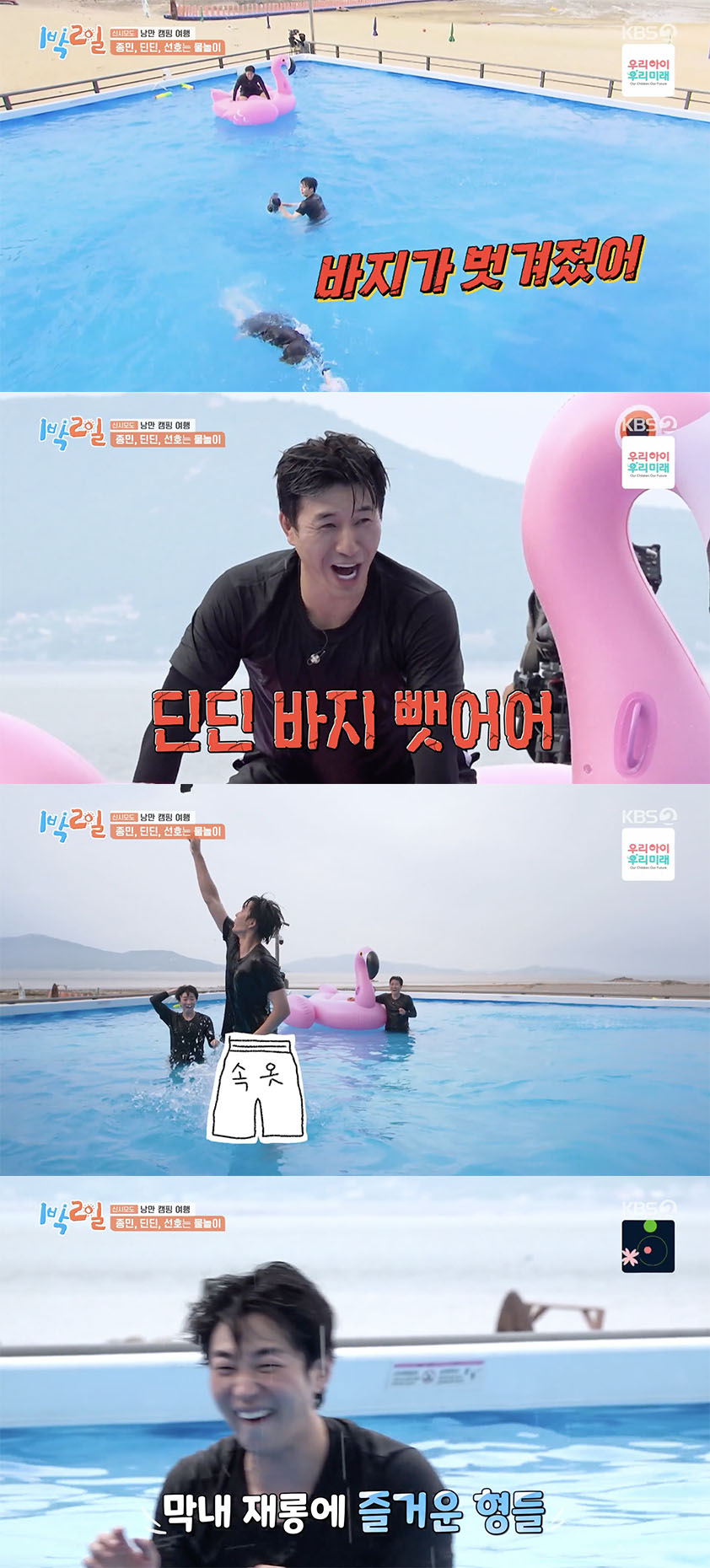 유선호는 높이 있는 자신의 바지를 가져가기 위해 물속에서 높이 점프했고, 그 과정에서 속옷이 노출돼 현장을 웃음바다로 만들었다.