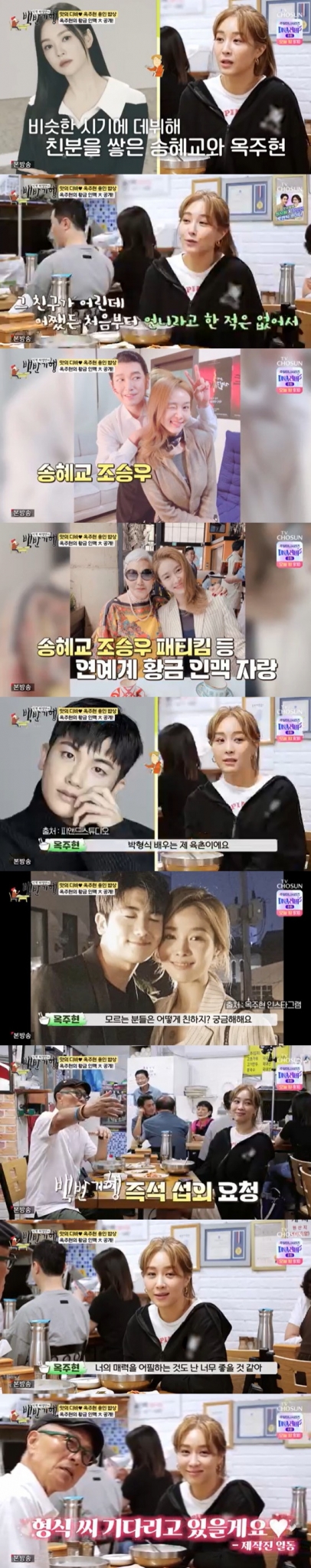 '백반기행'에서 그룹 핑클 멤버 겸 뮤지컬배우 옥주현이 송혜교, 패티김 등 세대불문 화려한 인맥을 자랑했다.