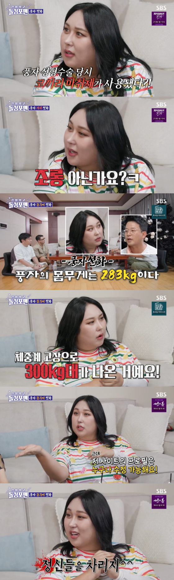풍자는 "방송에서 몸무게를 재는데 체중계가 고장이 나서 300kg대가 나온 거다. 웃기다고 생각하고 넘겼는데 모든 분들이 진지하게 받아들이더라"고 억울함을 호소했다.