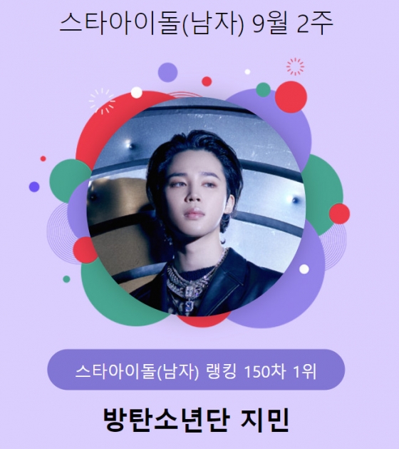 지민은 지난 9월 5일 오후 3시 1분부터 9월 12일 오후 3시까지 진행된 9월 2주(150차) 스타랭킹 스타아이돌 남자 랭킹 투표에서 3만 6083표를 받아 1위를 차지했다. 이로써 지민은 투표 시작 이래로 150주 연속 1위를 지켜내며 자신의 영향력을 입증했다.