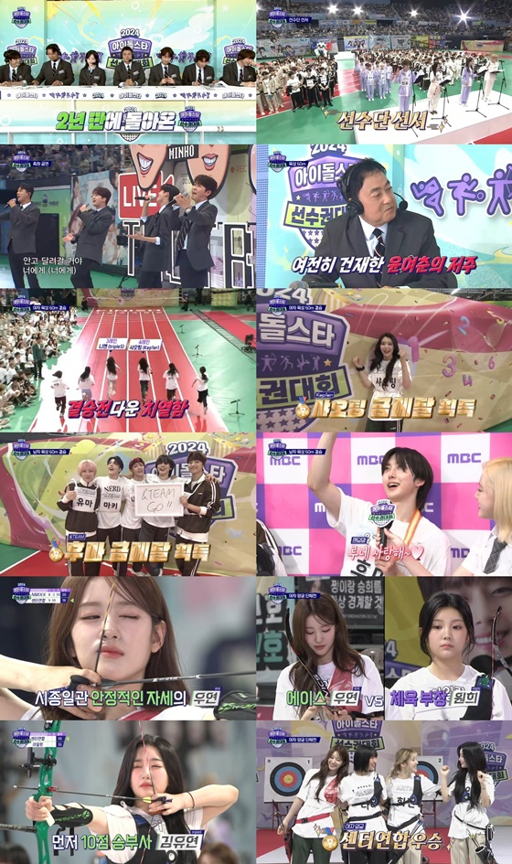2년 만에 다시 돌아온 만큼 화려한 MC 라인업을 자랑한 '2024 아육대'는 전현무, 장민호, 영탁, 이찬원, 강다니엘, 엔믹스 해원, 정동원까지 개막식 시작부터 7MC의 화려한 입담과 케미를 보여줬다. 투어스 신유, 아일릿 원희, 엔믹스 설윤, 엔시티 위시 시온의 선서로 '아이돌스타 선수권대회'의 시작을 알린 '아육대'는 이어 '트롯보이즈'(장민호, 영탁, 이찬원, 정동원)의 흥 넘치는 질풍가도 무대까지 보여주며, 아이돌들의 축제의 장을 열었다.