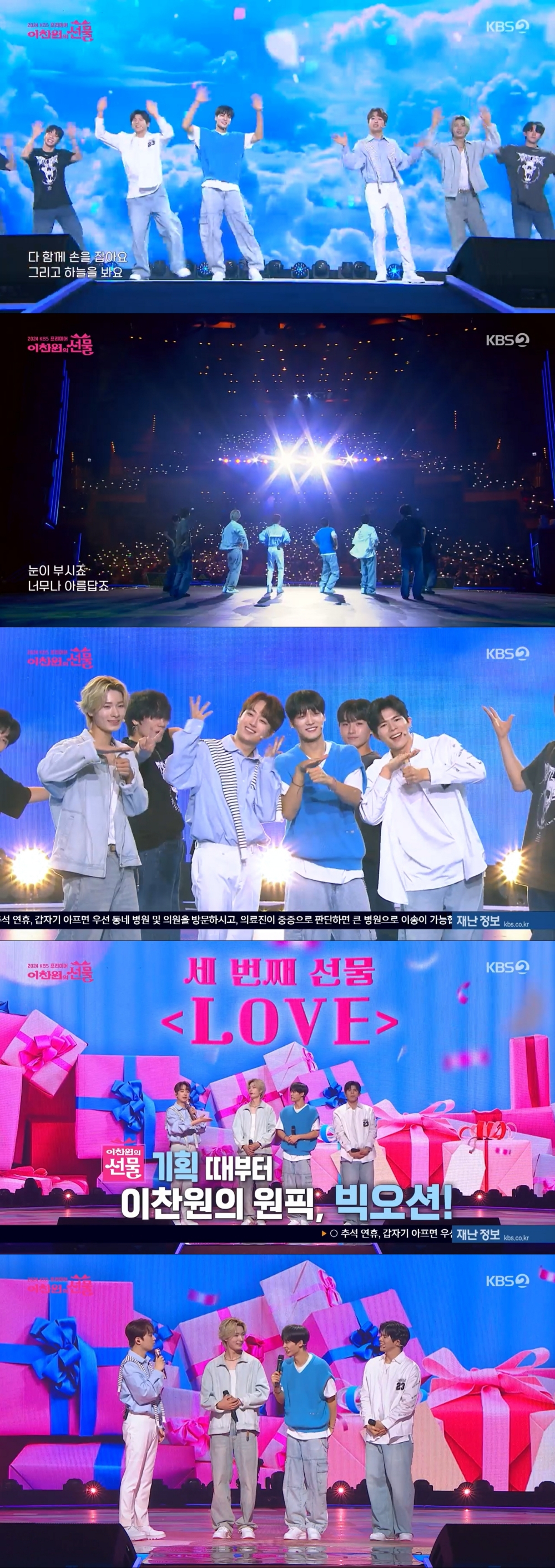 빅오션(찬연, 현진, 지석)은 지난 17일 방송된 KBS2 '추석특집쇼 이찬원의 선물'(이하 '이찬원의 선물')에 출연해 이찬원과 함께 데뷔곡 '빛(Glow)'의 특별한 컬래버레이션 무대를 꾸몄다. '이찬원의 선물'은 한가위 특집으로 꾸며진 이찬원의 생애 첫 지상파 단독쇼다.