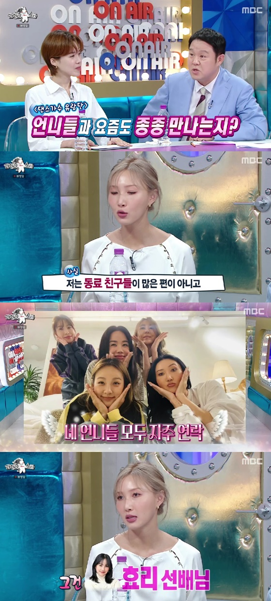 이날 화사는 '댄스 가수 유랑단' 멤버들과 자주 만나냐는 질문에 "저는 동료 친구들이 많은 편이 아닌데, 오히려 선배님이나 언니들이 많이 곁에서 지켜준다"고 밝혔다.