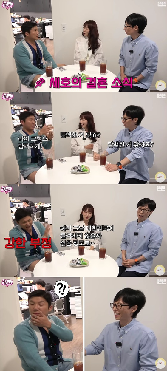 오는 10월 결혼식을 앞둔 조세호는 "하나하나 이제 준비된 것들을 하고 있다. 얼마 전에 웨딩 사진도 찍었다. 찍자마자 (재석이 형)한테 보냈다. 동욱이 형은 현장에 왔었다"라며 "자주 못 본다고 했는데 웨딩 촬영 들러리가 왔다고 기사도 났더라"고 전했다.