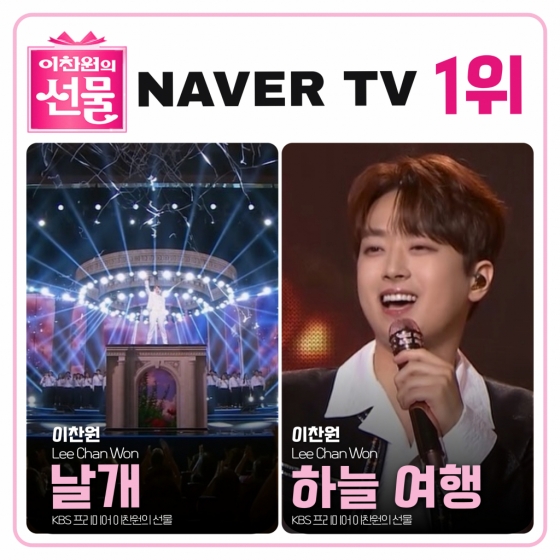 이찬원이 지난 17일 2024 KBS 2TV 추석 특집쇼 '이찬원의 선물'에서 선보인 '날개'와 '하늘여행' 무대 영상은 각각 네이버 TV 1위에 올랐다.