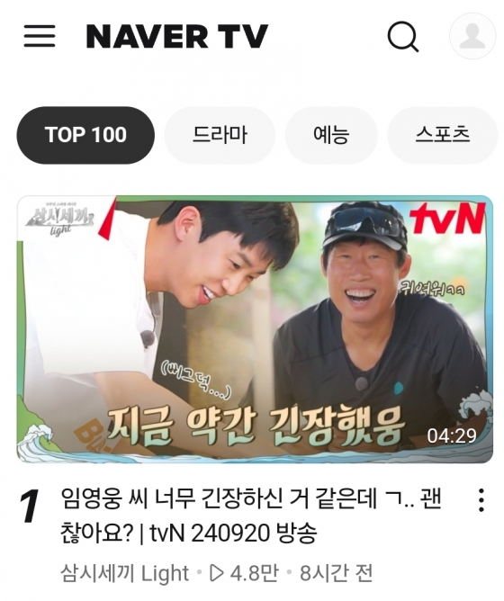 지난 20일 네이버TV '삼시세끼 Light' 채널에 공개된 '임영웅 씨 너무 긴장하신 거 같은데 ㄱ..괜찮아요?' 영상은 21일 오전 7시 기준 네이버TV TOP100 1위를 기록했다.