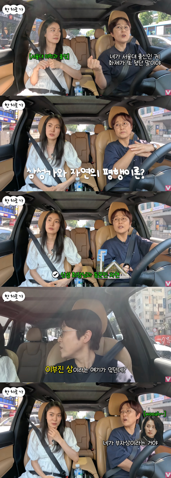 이를 들은 송은이는 의미심장한 미소를 지으며 "너와 삼성가 사이 묘한 평행이론이 있다는 말이 돈다"며 "삼성 회장이 서울대를 나오지 않았나. 그리고 너는 부잣집의 우아한 역할을 많이 하지 않았나. 이부진 상이라는 얘기가 있더라"고 주장해 웃음을 자아냈다.