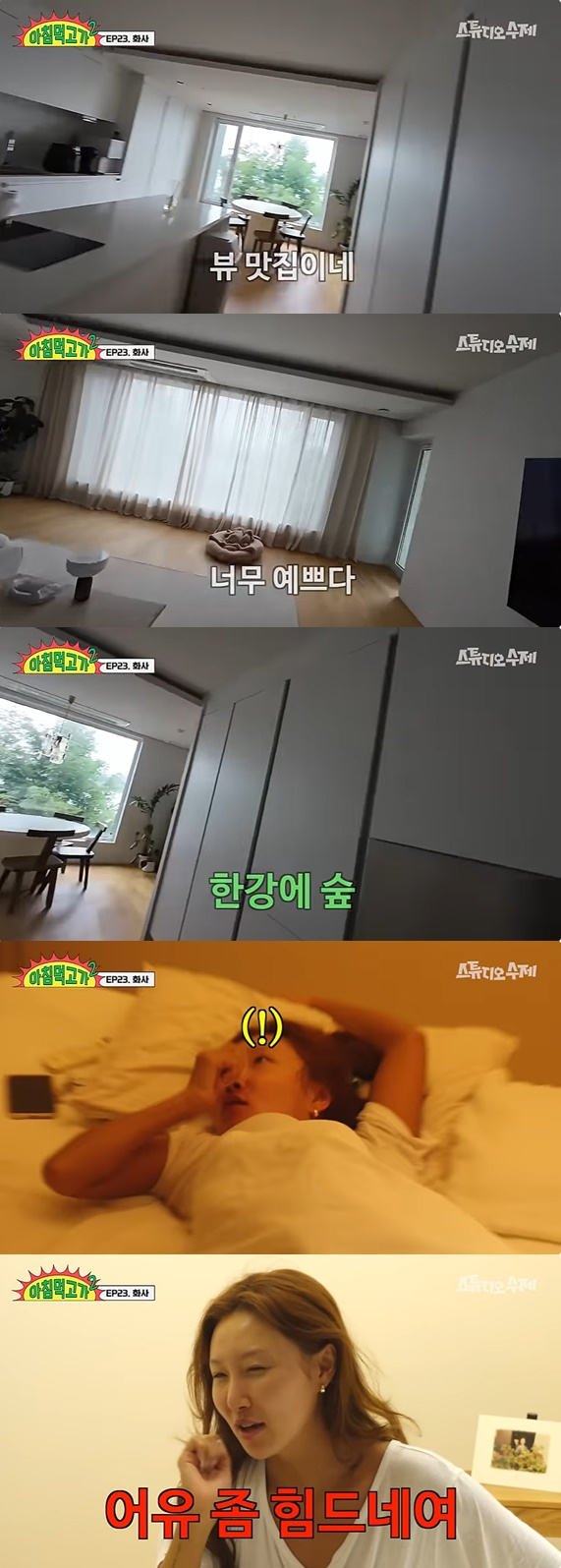 화사를 깨운 장성규는 "이 집을 검색해보니까 비싸더라. 50억 정도이던데 자가냐"라고 물었다. 이에 화사는 "아니다. 아직 자가는 아니다. 저는 계속 전세로 이사 다녔다. 주변에서는 건물을 사라고 하는데 저는 철 없을 수도 있지만 지금 사는 그 공간이 중요하다. 이 집은 처음 보자마자 여기서 살고 싶었다"라고 밝혔다.