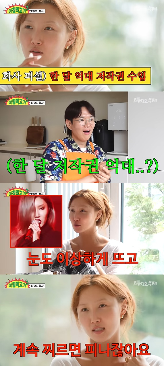 장성규는 "'멍청이'와 '마리아' 두 곡이 직접 만든 곡 아니냐. 직접 만든 곡들이 대박이 나서 저작권료가 많이 들어올 것 같다. 한 달에 얼마 정도 들어오냐"라고 물었다. 그러자 화사는 "내가 돈을 일부러 많이 안본다. 신경 쓰일까봐 많이 안 본다"라며 "많이 들어올때는 한 달에 억대로 들어왔다"라고 말해 놀라움을 전했다.