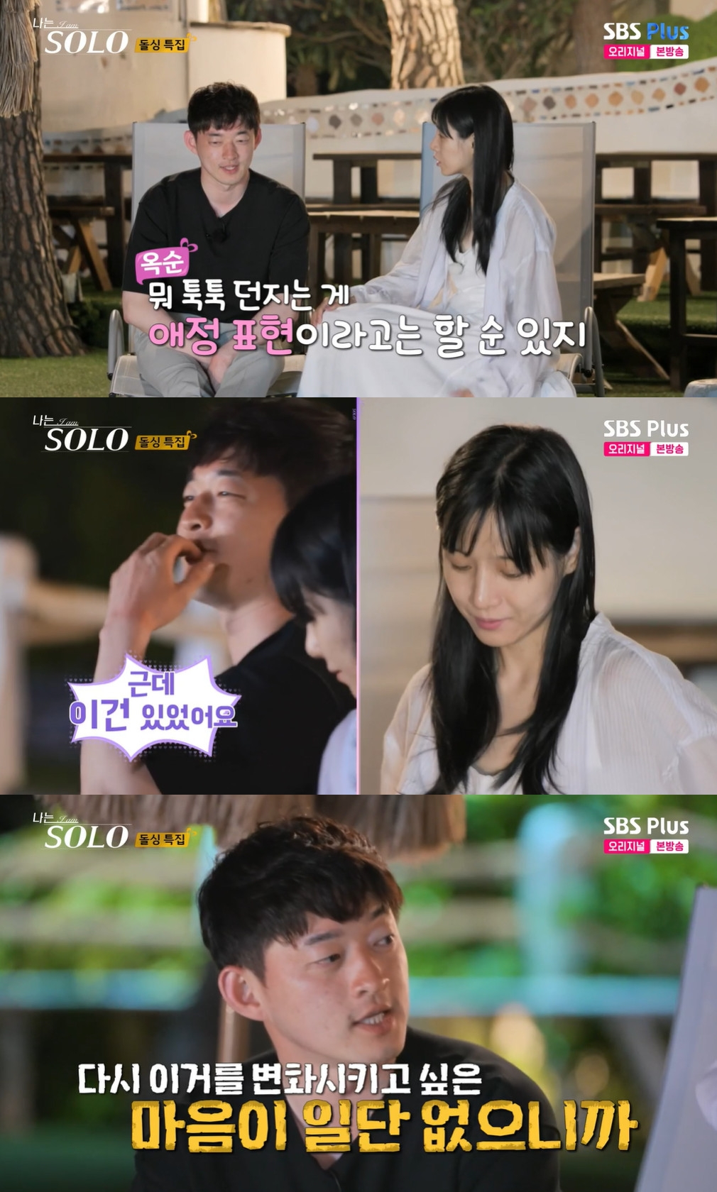 이날 옥순과 영호가 1대1 데이트했다. 이때 옥순은 "툭툭 던지는 게 애정 표현이라고 할 수도 있다. 근데 나한테 잦지도 않았다. 매일 순자 님과 놀았다. 그래서 날 안 좋아한다고 생각했다. 기분이 나빴다는 거다"라고 털어놨다.