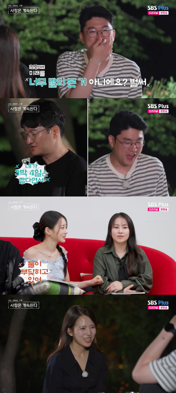 옆에서 이를 듣던 영수는 "너무 앞서 나가는 것 같다"며 웃었고, 영숙은 잠시 생각하다 "'우리 지금부터 1일이야' 보다는 썸이 맞는 것 같다"고 답했다.