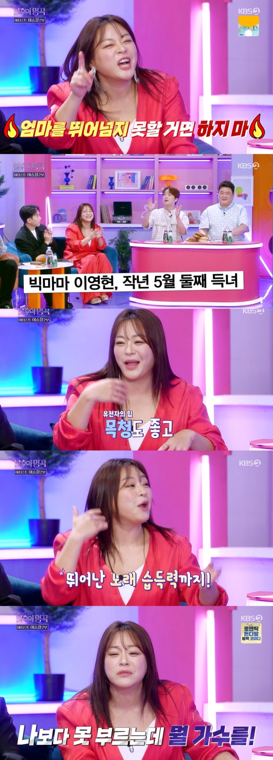 이에 MC 이찬원이 "만약 딸들이 엄마처럼 가수를 꿈꾸면 적극적으로 미뤄줄 생각이 있냐"라고 물었다. 이에 이영현은 단호히 "아니요"라고 답했다.