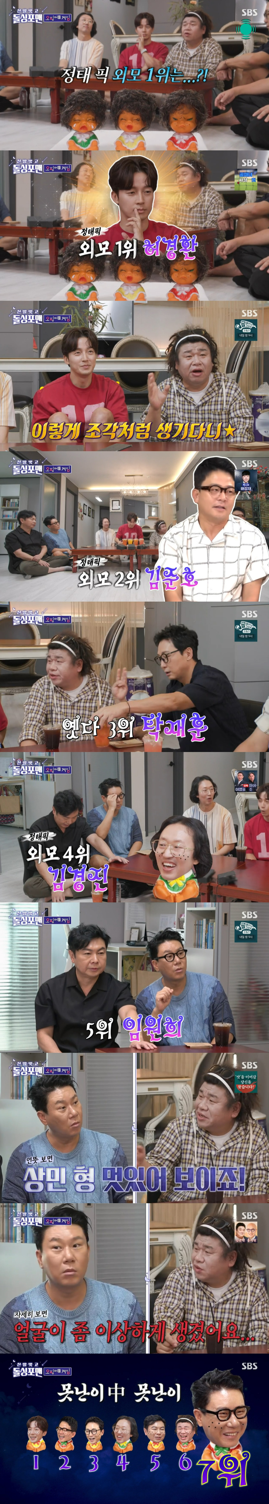 결국 오정태가 상황 정리에 나섰다. 그는 '돌싱포맨' 전체 출연진의 외모 순위를 매겨 모두를 당황하게 만들었다. 오정태는 "얼굴만 보는 거다. 허경환이 1등이다. 솔직히 경환이 처음 봤을 때 깜짝 놀랐다. 조각처럼 생겼다. 복근도 있다"라며 허경환의 비주얼을 극찬했다.