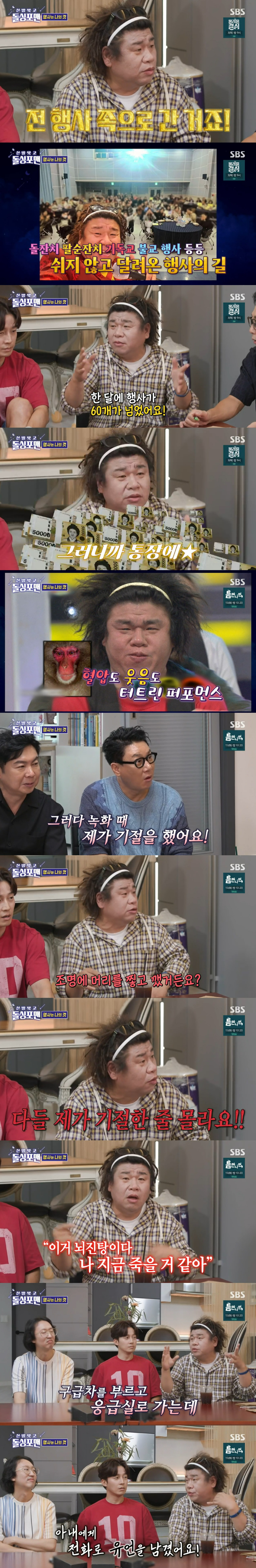뿐만 아니라 오정태는 행사를 하다가 구급차에 탄 사연을 공개했다. 그는 "부산 돼지 껍데기집 모델이었다. 오픈할 때마다 내려가기로 약속을 했다. 일주일에 3~4번 부산을 내려갔었다. 당시 개그 프로그램에서 빨간 원숭이 개인기를 했다. 숨을 참다가 힘을 빡 주면 얼굴이 빨개진다. 그러면 다들 빵빵 터진다. 그러다 녹화 때 기절을 했다. 조명에 머리를 찧고 깼다. 근데 다들 내가 기절한 줄 모르더라. 다들 웃고 있는 거다"라고 말했다.