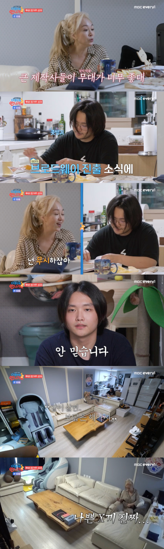 이후 잠에서 깬 황성재가 부엌으로 나오자 박해미는 "오늘 아침에 뉴욕 담당자랑 통화를 했는데 큰 제작사들이 우리 뮤지컬 무대가 너무 좋다고 했다더라"고 자랑했다.