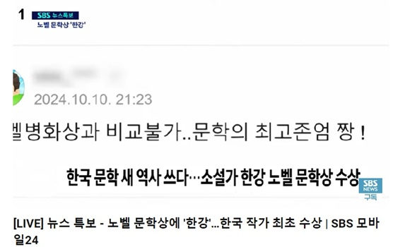 해당 영상에서 SBS는 한강의 노벨문학상 수상 관련 특보를 전하던 중 '노벨병화상과 비교불가.. 문학의 최고 존엄 짱!'이라는 댓글을 자료화면으로 사용해 논란이 됐다. 이를 두고 2000년 고(故) 김대중 전 대통령의 노벨평화상 수상을 비하한 것이 아니냐는 지적이 나왔다.