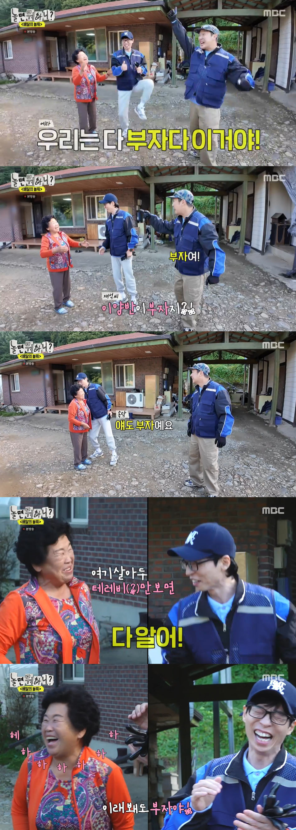 그러면서 하하에게 유재석을 가리키며 "이 양반도 부자지?"라고 물었다. 이에 하하는 고개를 끄덕거리며 "부자 맞다"라고 했다. 그러자 유재석은 "우리는 모두 부자야!"라며 유쾌하게 재력을 인정했다.