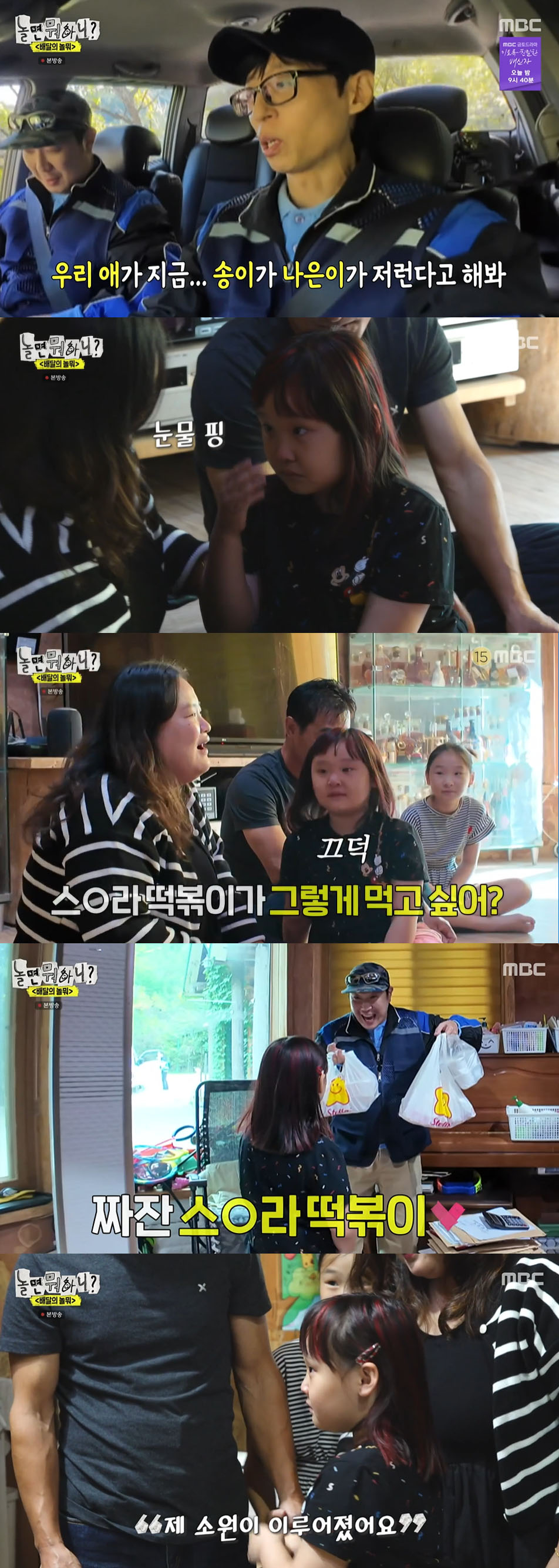 어렵사리 떡볶이를 품에 받게 된 서하는 엄마 품에서 눈물을 흘리며 행복해하는 모습을 보였다. 이어 그는 유재석과 하하에게 "제 소원이 이뤄졌어요"라며 고마움을 표해 보는 이들의 감동을 자아냈다.