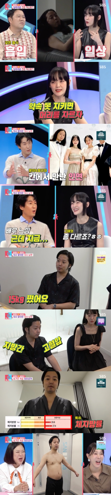김윤아는 "살이 쪄서 외형이 달라지는 게 문제가 아니라 지방간, 고혈압 등에 대한 위험이 있더라. (김형규가) 면역력도 떨어져서 코로나, 장염, 식중독, 이상한 감기 같은 걸 계속 걸린다"고 걱정했다.