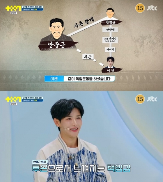 이첸 연습생은 자신이 안중근 의사의 후손이라며 "고조할아버지가 안명근 선생님이다. 안명근 선생님이 안중근 선생님의 사촌으로 독립운동을 함께 하셨다"라고 밝혔다.