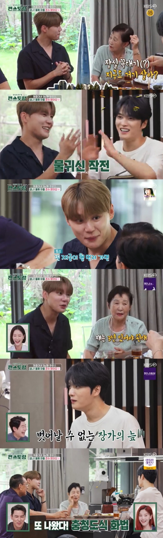 김준수는 이에 "전 재중이 형이 먼저 가면"이라고 했고, 김재중 어머니는 "쟤는 3년 있다가 간대"라고 말했다. 김준수는 "(김재중이) 3년 있다가 (장가) 간다는 말을 20년째 듣고 있다. 손주 보고 싶으시지 않냐"라고 했고, 김재중 어머니는 "혼자 사는 게 편하고 혼자 살아도 돼"라고 충청도식 화법으로 말해 웃음을 자아냈다.