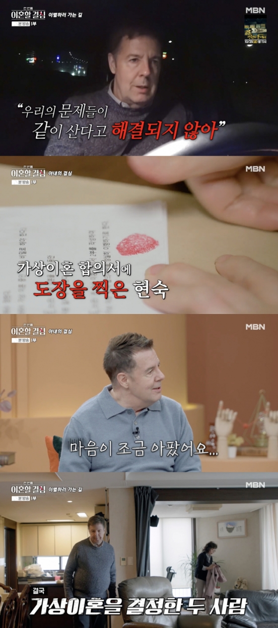 20일 밤 방송된 MBN 예능 프로그램 '한 번쯤 이혼할 결심' 14회에서는 긴 고민 끝에 가상 이혼에 동의한 로버트 할리 아내 현숙의 모습이 그려졌다.